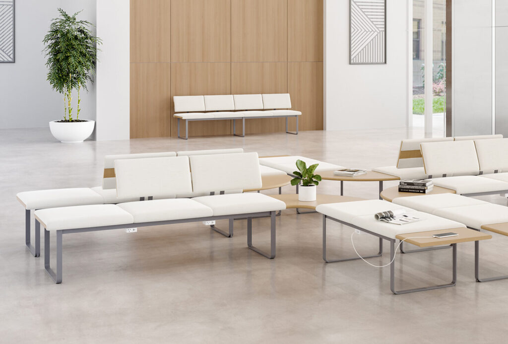 - Integrated, connecting and end tables offered in white oak veneer, laminate, Corian and Fenix.