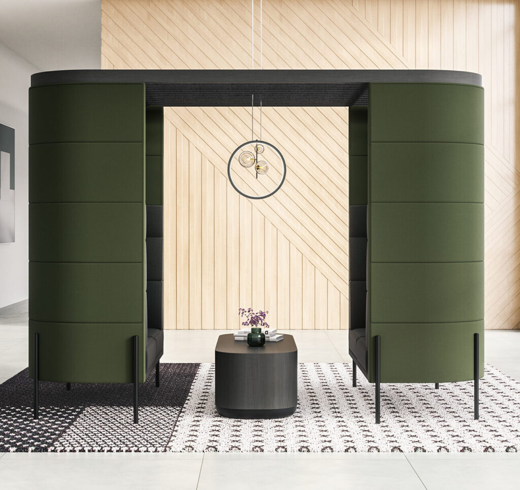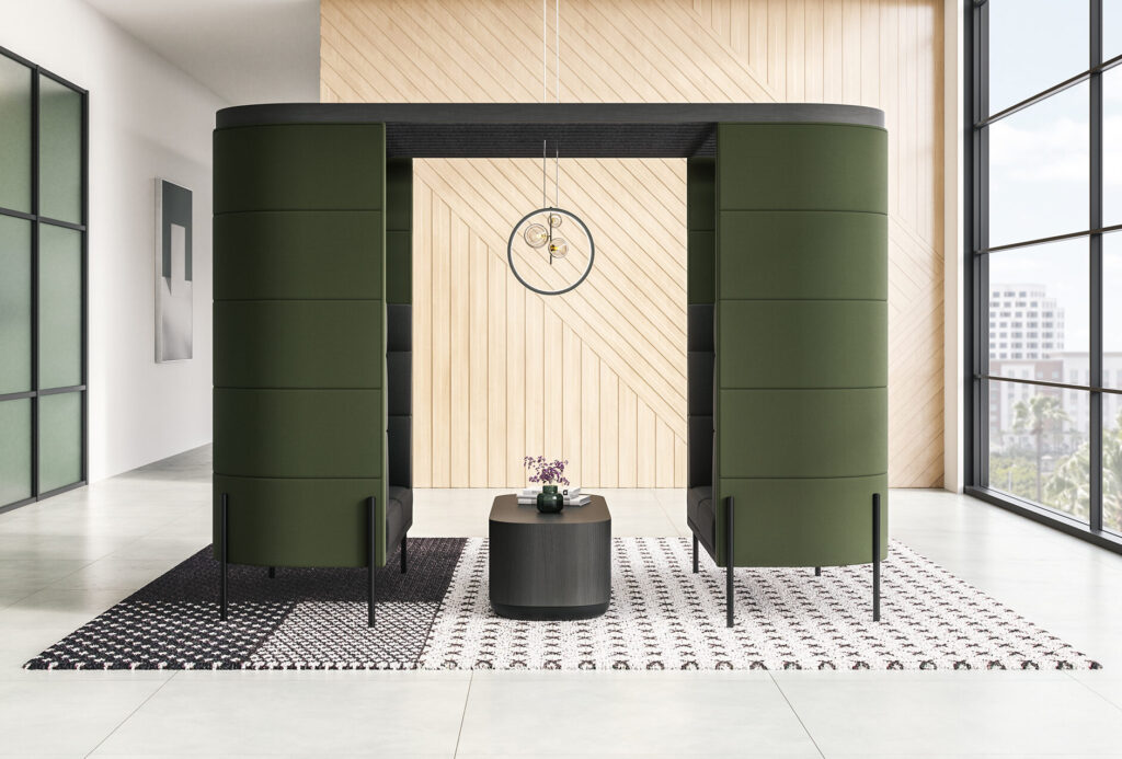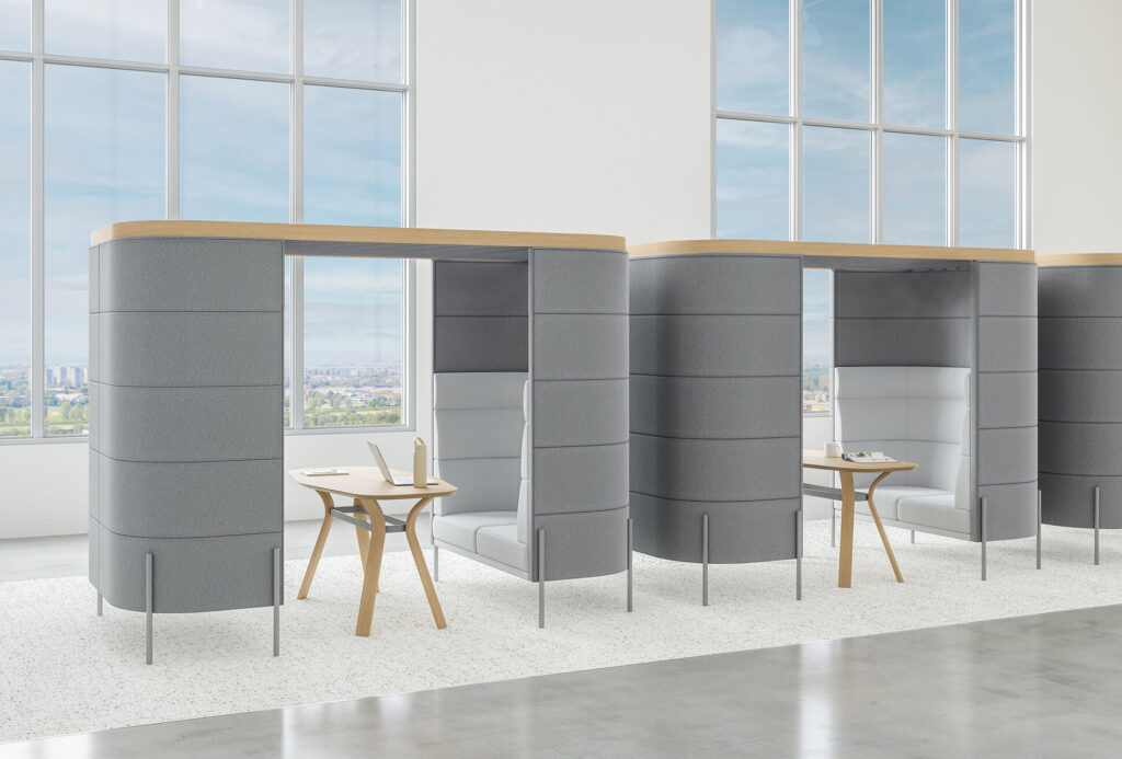 - Pre-configured booths include wood canopy frame and PET acoustical slats.